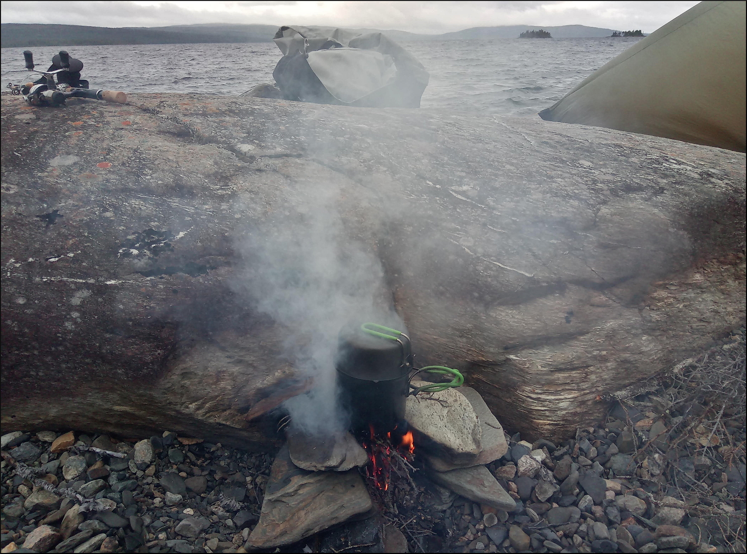 Fick fyr på uteköket med torrt granris och drivved. Nytt rekord, gröt på en dryg halvtimme bara.