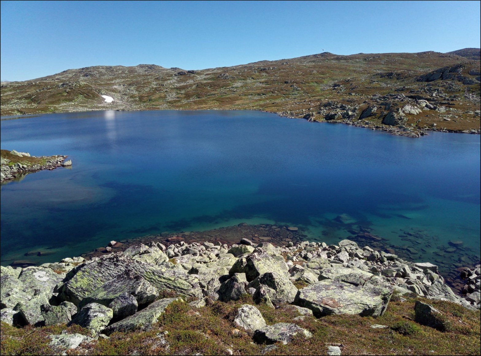 Kom iväg strax efter åtta och siktade på ett litet pass under branten ovanför min tältplats. Gick hyfsat även om svetten bara forsade i den plötsliga värmen.