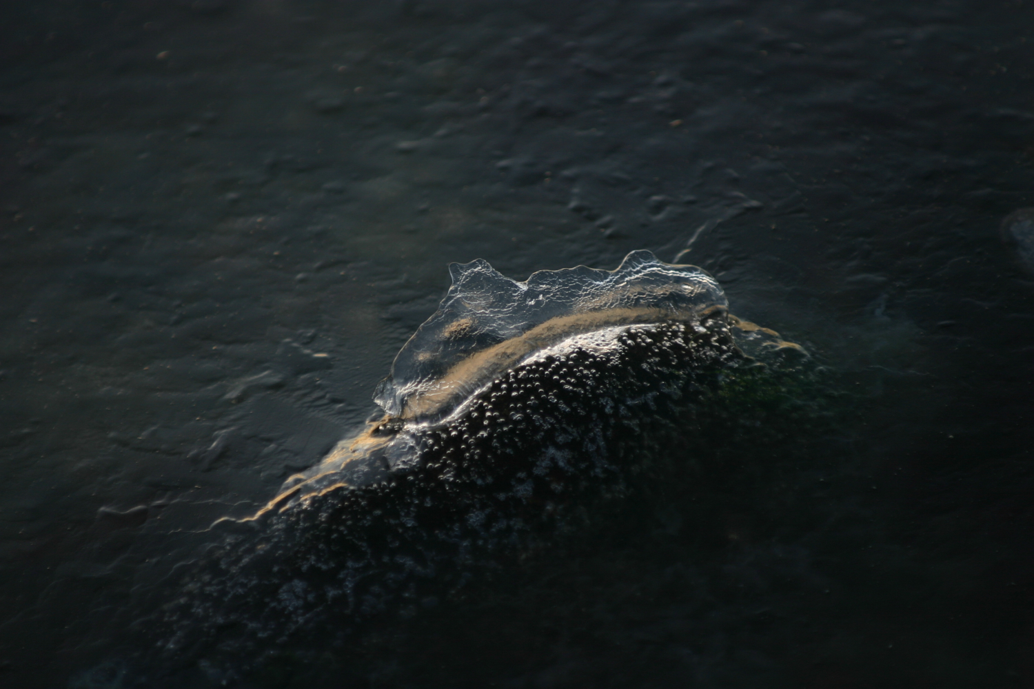 Gölen i skogen fryser till och töar om vart annat. Lite snö har töat och bildat en frusen bäckfåra ovanpå isen.
