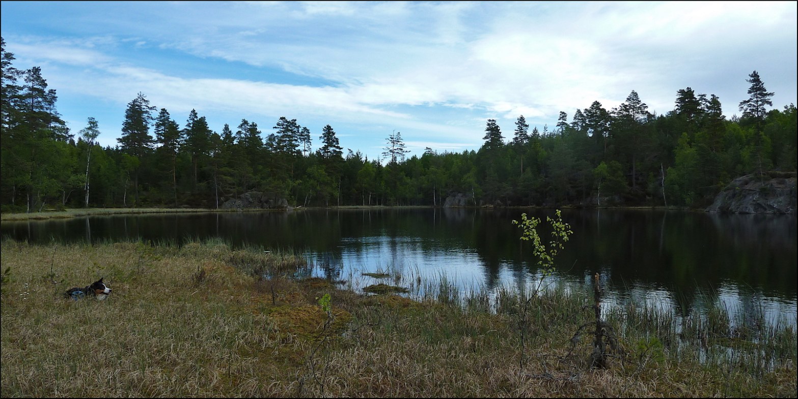 När vi väl bestämde oss gick det snabbt. Solen i öster gav snabbt bastuvärme i tältet. Helt stilla på sjön och varmt i luften.