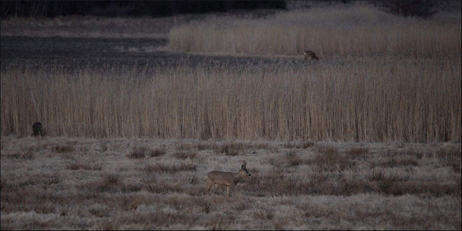 Vad är det som lurar i vassen? På hemväg vid 10-tiden på kvällen gick solen ner i tunna slöjmoln och det varma ljuset försvann direkt. Kanske det var det som gjorde att ett par mörka långa öron syntes tydligt mot fjolårsvassen.
